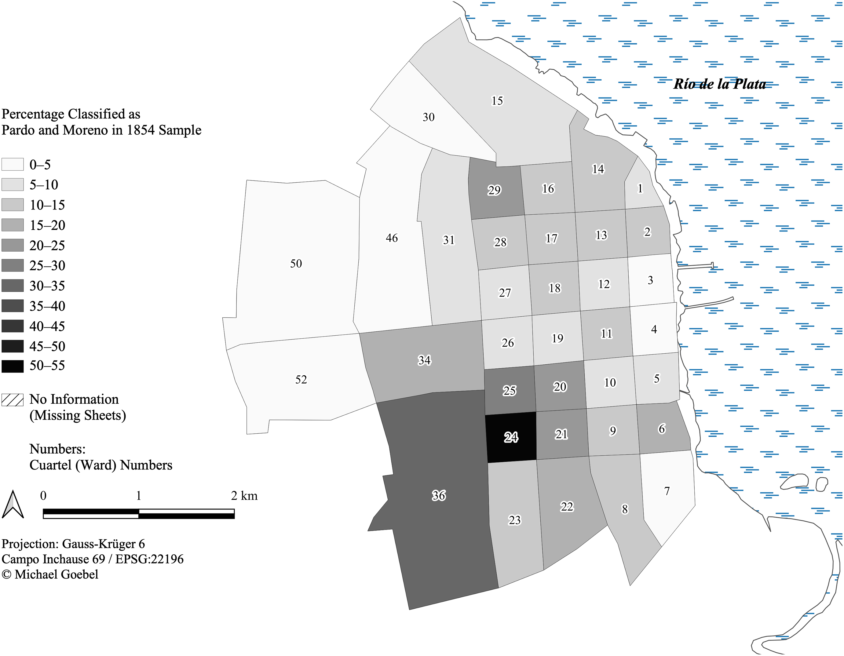 Map 2. Racial Distribution, Buenos Aires, 1854.
