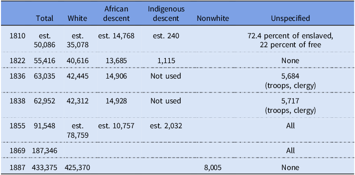 In this confusing relationship between self-identification and assignment by enumerators lies the theory’s first problem. Although censuses partly rested on information about household members by whoever opened the door, designation by enumerators was the dominant mode of classification in nineteenth-century Latin American censuses, as well as other demographic records (Loveman Reference Loveman2014: 174–5). The censuses of 1836 and 1838, in which heads of household or homeowners (as opposed to enumerators) played a larger role in classification, do not suggest that greater leeway for self-identification entailed statistical whitening. After all, they recorded the century’s largest Afro-descendant totals (Table 1), which likely had little to do with classification modes at all, but instead stemmed from the previous resurgence of the slave trade and high Black homeownership rates, magnified by household enumeration. Either way, they furnish no evidence that self-classification swayed the racial composition of results, which is the implicit assumption of the trigueño theory.