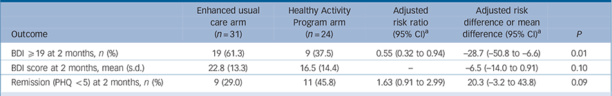 | BDI ⩾19 at 2 months, n (%) | 19 (61.3) | 9 (37.5) | 0.55 (0.32 to 0.94) | −28.7 (−50.8 to −6.6) | 0.01 |
