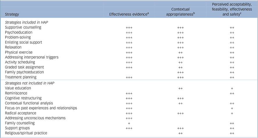 From the evidence-based treatments identified as described in Step A, we identified specific strategies following a procedure similar to the distillation process Reference Chorpita, Daleiden and Weisz20 whereby interventions are conceptualised not as single units of analysis, but rather as composites of individual strategies, techniques or components that can be classified. We referred to the psychological treatment manuals and literature Reference Lambert22–Reference Walsh and Shapiro26 and consulted the psychological treatment experts in our investigators' group to ensure our list of strategies was accurate and complete. The following example illustrates this approach – the specific strategies identified from CBT were: psychoeducation, problem-solving, cognitive restructuring, activity scheduling and graded-task assignment. To this list of strategies, we added discrete contextually appropriate strategies identified in Step B.