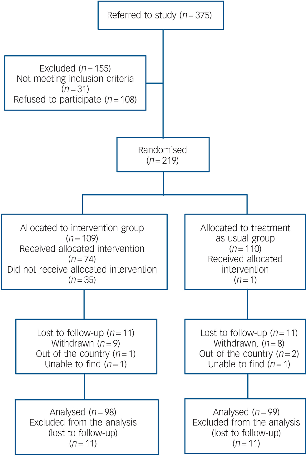 Participants were recruited between November 2004 and September 2006. Of the 375 people referred to the study, 220 entered into the study (Fig. 1). One participant withdrew between the baseline assessments and randomisation leaving 219 participants. There were no substantial differences between the two randomised arms on any baseline variables (Table 1). Twenty-two participants were lost to follow-up at 1 year. There were no significant baseline differences at P<0.05 in sociodemographic or clinical variables between those who were and those who were not lost to follow-up (Table 2), although there was some weak evidence that the BPRS and GAF were different (at P<0.1), with those followed up being slightly less symptomatic and higher functioning.