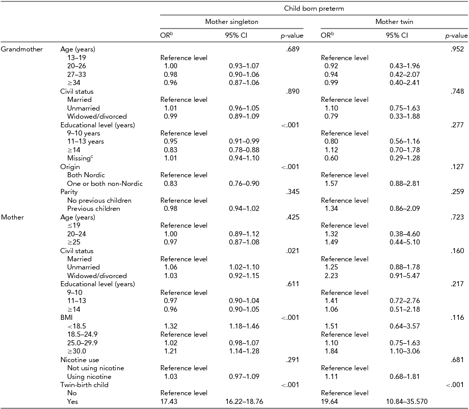 Multiple logistic regressions, stratified by singletons and twins, estimating the odds ratio for delivering a preterm child showed that the odds for preterm birth among mothers born as singletons decreased if the grandmother of the child had a high level of education (≥14 years), or at least one maternal grandparent born outside the Nordic countries (Table 2a).