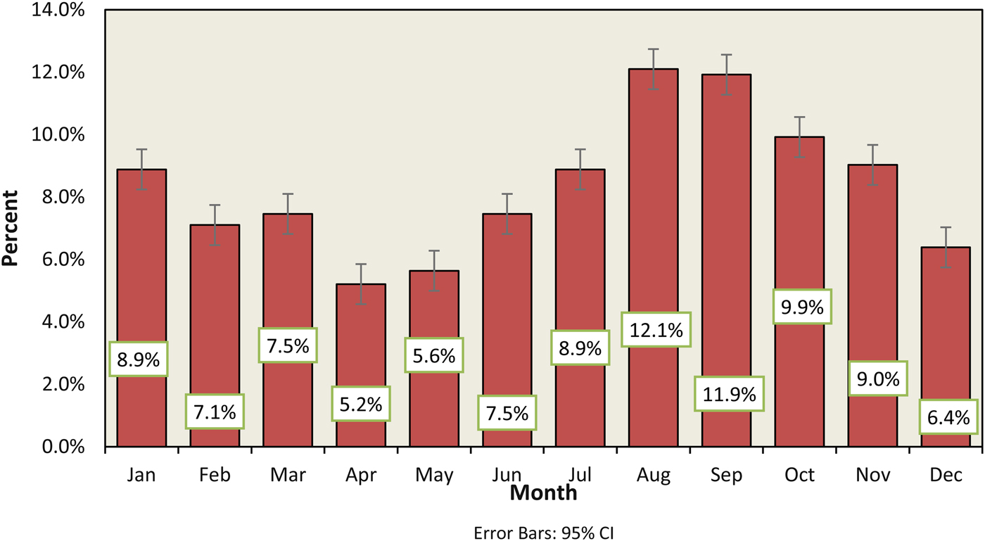 Fig. 1. Monthly incidence of P. aeruginosa in otitis externa infection from 2008 to 2016.