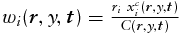 {w_{\rm{i}}}\left( {{\bm{r}},y,t} \right) = {a_i} + \mathop \sum \limits_{j = 1}^6 {a_{ij}}{\rm{ln}}({r_j}) + {b_i}\ t + {d_i}\ Bt\left( t \right) + {e_i}\ HT\left( t \right) + {\epsilon _i},