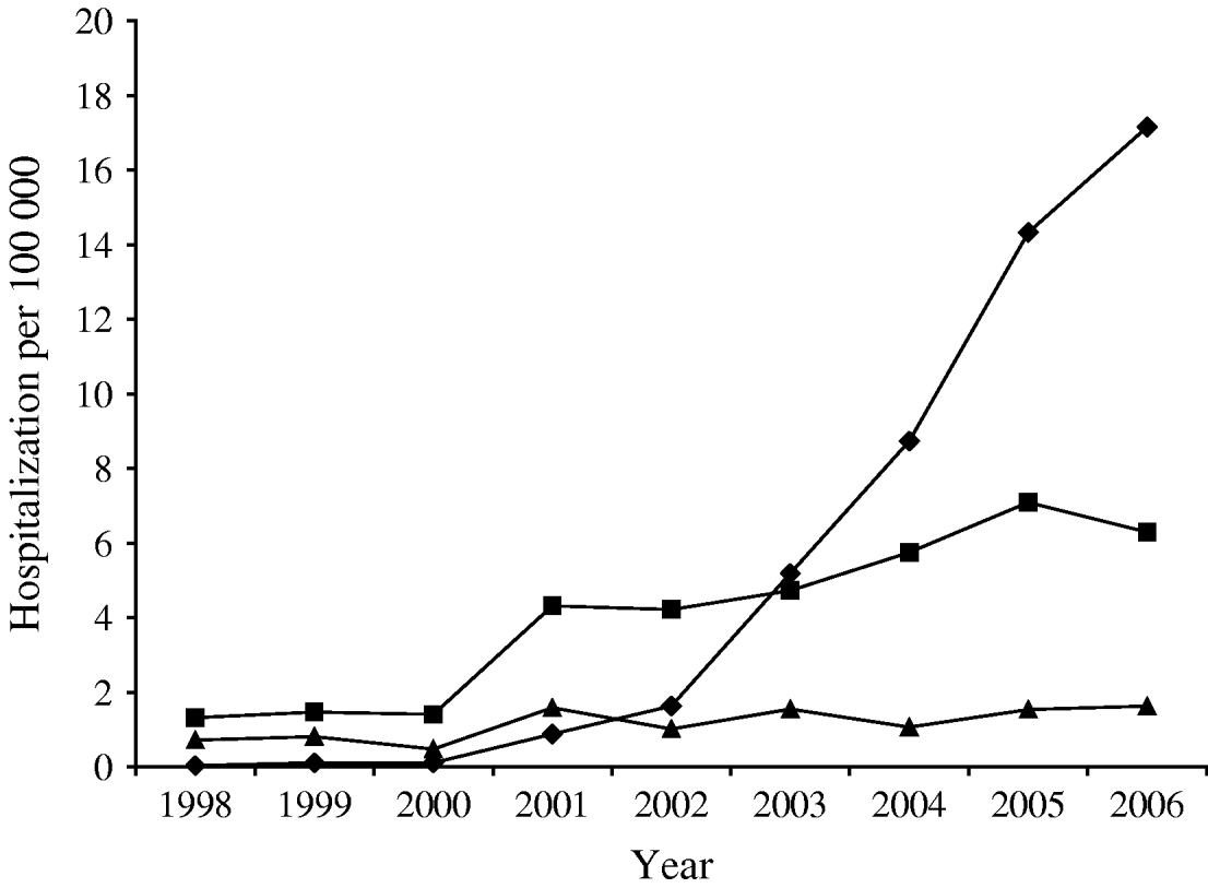 Fig. 1. Age-adjusted trend of hospitalization across time, 1998–2006 for methicillin-resistant Staphylococcus aureus (MRSA, –◆–), methicillin-susceptible S. aureus (MSSA, –▪–), and Streptococcus species (–▴–) skin and soft-tissue infection (SSTI) cases in paediatric patients, Los Angeles County.
