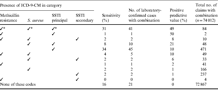 Table 1. Sensitivity and positive predictive value of different ICD-9-CM combinations for MRSA skin and soft-tissue infection (SSTI), compared with laboratory-confirmed paediatric-associated cases, Los Angles County (n=133)
