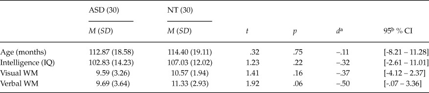Sixty participants in total took part in this study, all of them enrolled in mainstream schools. They ranged in age from 84 to 145 months (7 years old - 12 years and 1 month old), with an average age of 113.63 months (SD = 18.71) – 9 years and 5 months old. Thirty participants (5 girls and 25 boys) were diagnosed with autism spectrum disorder (ASD) by one or more specialists or psychologists, using specific tests for differential diagnosis: The Autism Diagnostic Observation Schedule (ADOS; Lord, Rutter, DiLavore, & Risi, Reference Lord, Rutter, DiLavore and Risi2008) and the Autism Diagnostic Interview–Revised (ADI-R; Rutter, Le Couteur, & Lord, Reference Rutter, Le Couteur and Lord2003). Another 30 participants (7 girls and 23 boys) comprised the neurotypical (NT) group. We compared the two groups according to chronological age (in months); intelligence (IQ, range: 80–130); visual WM; and verbal WM. In addition, they all correctly completed the first-order FB ToM task (see Materials). Table 1 presents descriptive data and between-groups comparisons, which did not indicate significant differences on all measures.