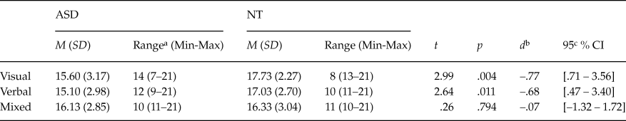 Between-groups differences (ASD – NT) in Faux Pas Test outcomes. With regard to Hypothesis 1, between-groups differences were calculated in the three modalities of faux pas – visual, verbal, and mixed. Significant between-groups differences were found when the story’s presentation modality was visual and verbal, however differences were not significant in the mixed modality. See Table 3.