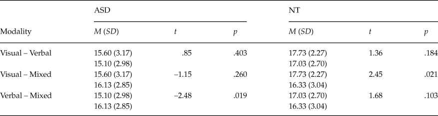Differences according to modality (visual, verbal or mixed) on Faux Pas test. With respect to Hypothesis 2 about the differences between modalities (visual, verbal, and mixed), results in the ASD group showed significant differences between verbal and mixed modalities (with lower scores in the verbal modality). The NT group, on the other hand, displayed significant differences between visual and mixed modalities (scoring lower on mixed). See Table 4.