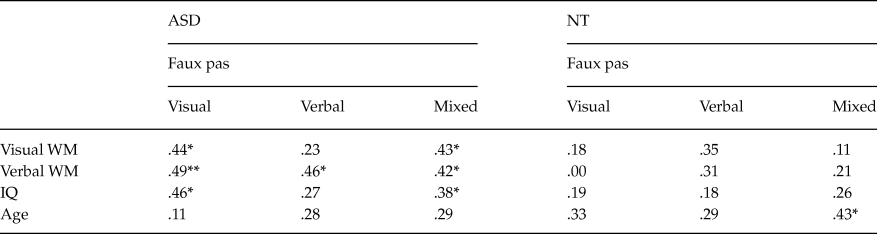 Table 5. Bivariate Correlations between Faux Pas, Visual WM, Verbal WM, and IQ in the ASD and NT Groups
