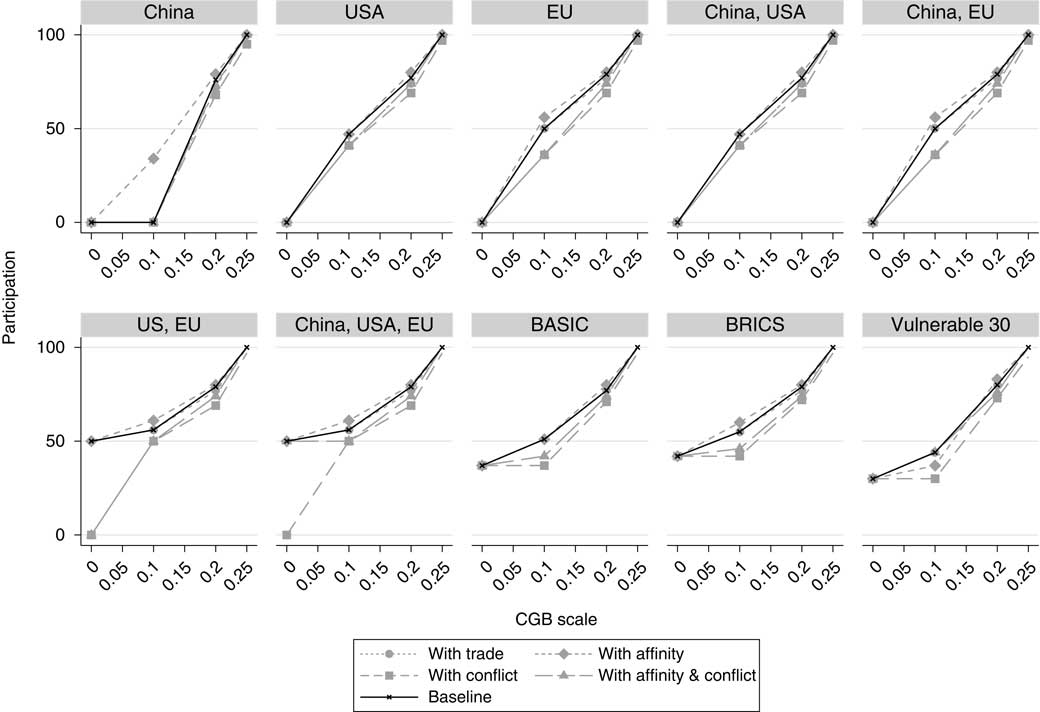 Fig. 3 Participation (share of global emissions contained in the club) as a function of CGB scale, in various scenarios Note: the header identifies the enthusiasts. Participation refers to the share of global emissions covered (1 denotes 100 per cent).