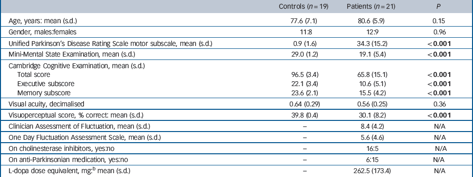 All participants had measurement of their best near visual acuity on Landolt broken rings or Snellen chart (test distance 40 cm) after correction of any refractive errors. Participants were only included in the study if they had no visual field defects and intact ocular movements on neurological examination. Assessment of visuoperceptual function was carried out using previously described angle discrimination and overlapping figures tasks. Reference Mosimann, Mather, Wesnes, O'Brien, Burn and McKeith31 Participants underwent 20 trials for each task and a visuoperceptual score was derived (sum of scores) for further analysis.