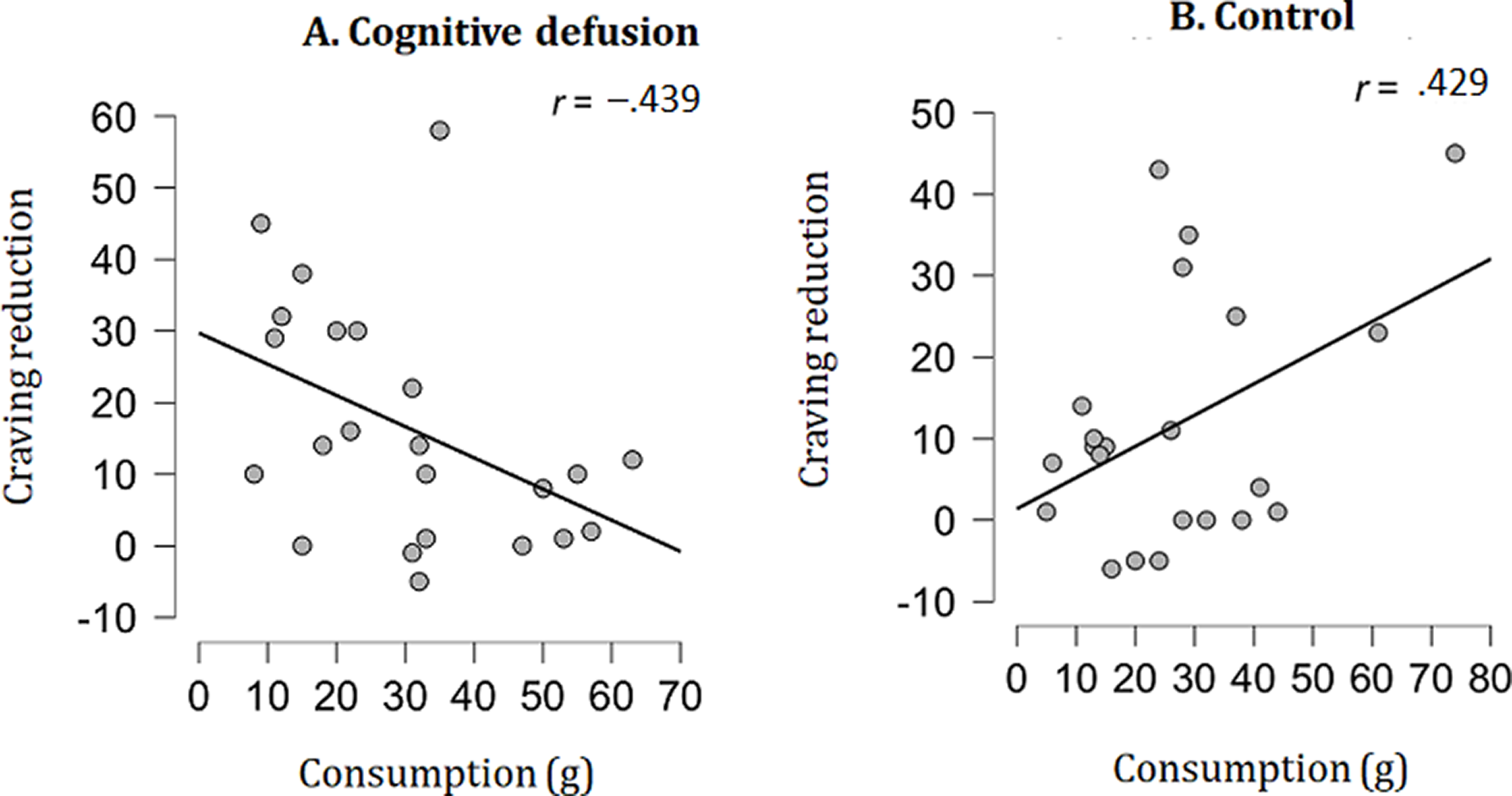 Figure 2. Study 1. Scatter Plots Showing Pearson’s Coefficients for the Correlation between Craving Reduction (Measured as VAS-2 Minus VAS-3 Score) and Chocolate Consumption on the Bogus Taste Test for Groups Cognitive Defusion (A) and Control (B)