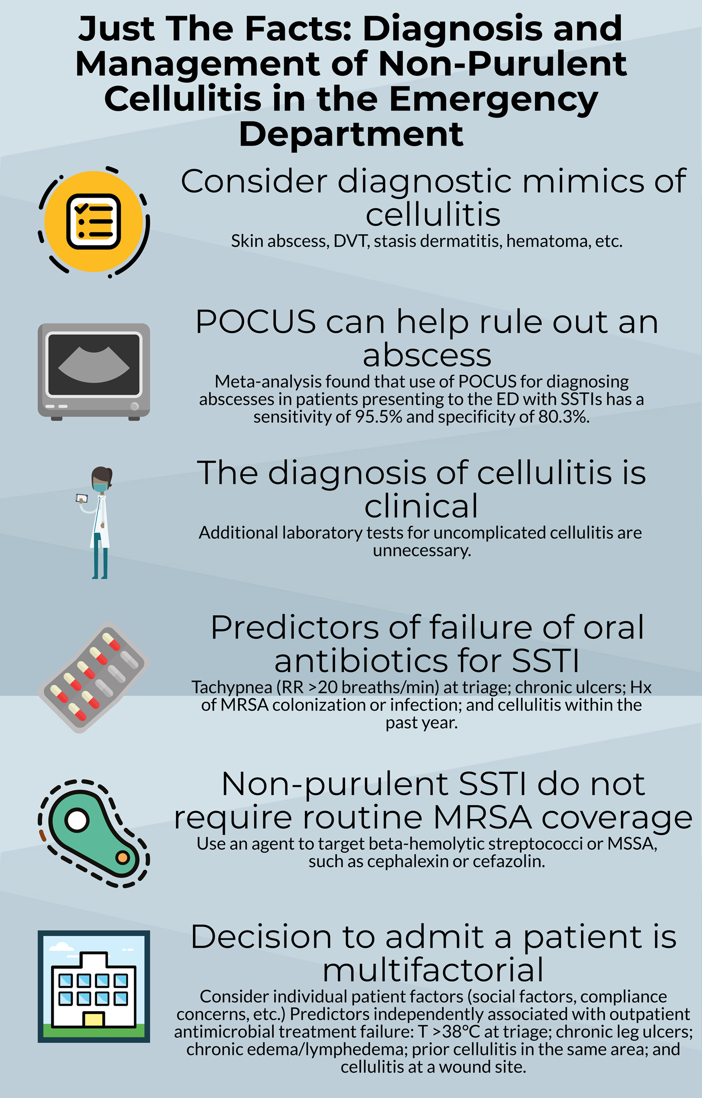 Differentiating abscesses from non-purulent cellulitis is important because the management is very different. A bedside procedure (incision and drainage, loop drainage or needle aspiration) is a vital component for managing abscesses. In contrast, antibiotics alone are required to treat non-purulent cellulitis. One tool at the emergency physician's disposal is the use of point-of-care ultrasonography (POCUS). A recent meta-analysis found that use of POCUS for diagnosing abscesses in ED patients with SSTIs has a sensitivity of 95.5% and specificity of 80.3%.Reference Barbic, Chenkin, Cho, Jelic and Scheuermeyer2 When there is clinical suspicion, POCUS should be used to rule out the presence of an underlying abscess.