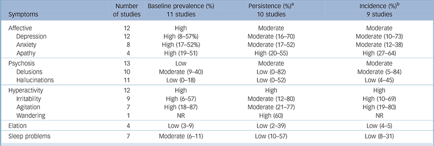 Loss to follow-up is a challenge in longitudinal studies, and we have reported the number of participants at the end of the follow-up period for the included studies (online Table DS1). There was large variation in follow-up completion (24–100%, although often not reported) and reasons for leaving the study were often not reported. Persistence of BPSD may be associated with mortality and with refusal to participate in follow-up interviews, and differences in follow-up completion may have influenced the results. Furthermore, we have used study baseline as a proxy for disease and symptom onset and this may have affected the findings on the persistence of symptoms. Symptom course may be influenced by pharmacological or non-pharmacological interventions. Although there was large variation in medication use between study populations, in the majority of studies that included a sensitivity analysis the results were not altered when taking into account medication use. As we are not aware of a formal definition of high prevalence, persistence or incidence, we summarised the findings as ‘low’ if the majority of studies found that the results were lower than that of most of the other symptoms included, ‘high’ if the majority found that results were higher than for most of the other symptoms and ‘moderate’ if the results were intermediate or mixed.