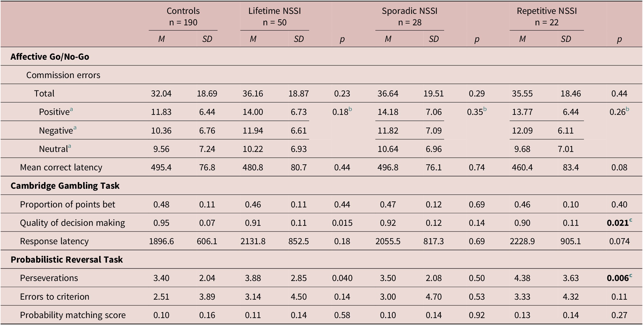 Results partially supported these hypotheses—we found evidence of a significant association with compulsivity, but not impulsivity. Compared to no-NSSI controls, adolescents with repetitive NSSI demonstrated significantly greater perseverance on an expired set of rules in the Probabilistic Reversal Task, which can be interpreted as a neuropsychological model of compulsivityReference Fineberg, Chamberlain and Goudriaan 24 , Reference Yücel, Oldenhof and Ahmed 50 , Reference Izquierdo and Jentsch 51 ; in this task, participants with repetitive NSSI engaged in persistent, repetitive behavior which no longer met their goals. However, neither sporadic nor repetitive NSSI was associated with impulsive decision making as indexed by the Cambridge Gambling Task or behavioral disinhibition on the Affective Go/No-Go task, even when the emotional valence of distractors was modified.