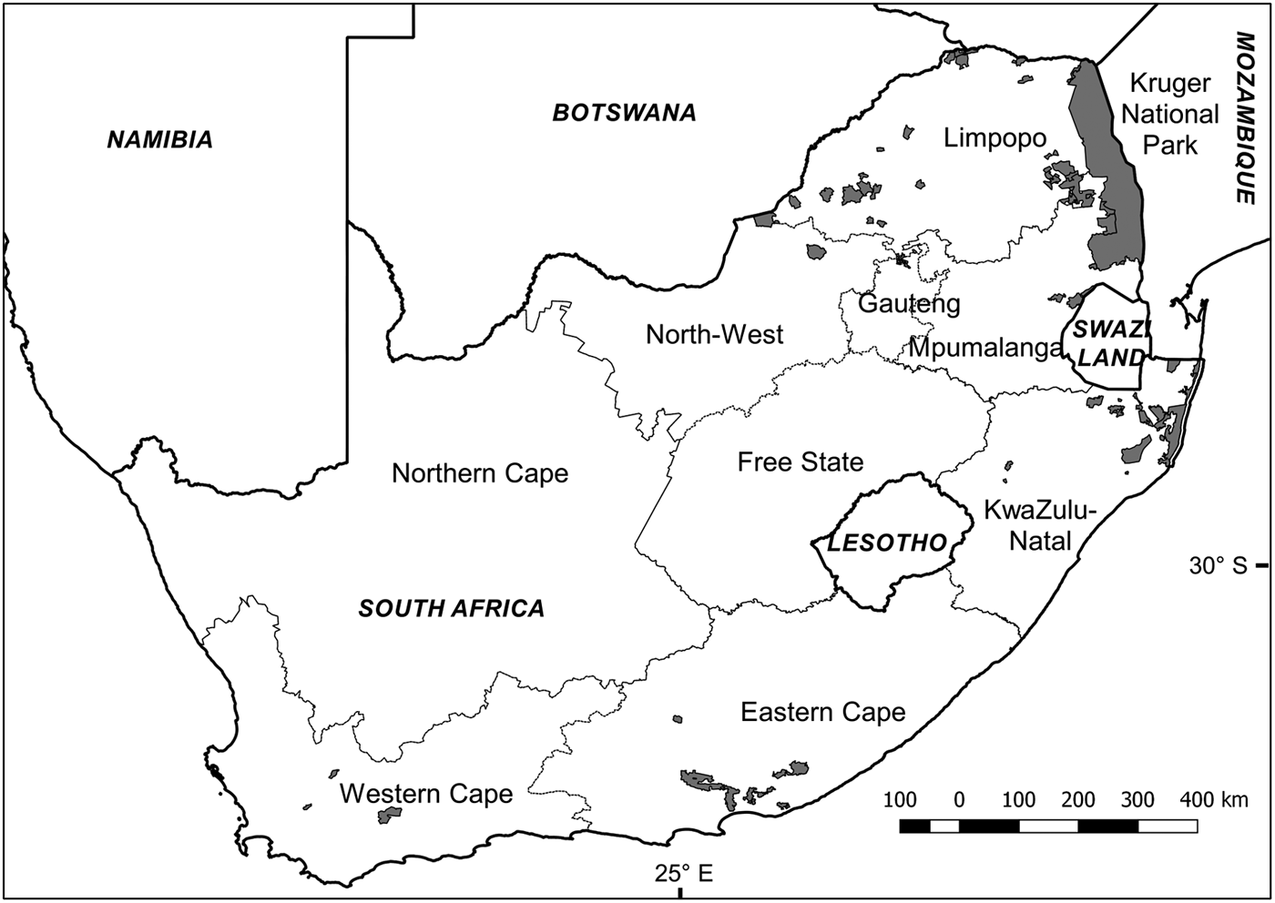 African elephants Loxodonta africana, categorized as Vulnerable on the IUCN Red List (Blanc, Reference Blanc2008), have been declining rapidly across the continent, largely as a result of increased poaching pressure and competition for resources with people and livestock (Bouché et al., Reference Bouché, Douglas-Hamilton, Wittemyer, Nianogo, Doucet, Lejeune and Vermeulen2011; Wittemyer et al., Reference Wittemyer, Northrup, Blanc, Douglas-Hamilton, Omondi and Burnham2014; Chase et al., Reference Chase, Schlossberg, Griffin, Bouché, Djene and Elkan2016). However, the elephant population in South Africa appears to have been increasing since 1992 (Hall-Martin, Reference Hall-Martin1992; Slotow et al., Reference Slotow, Garaï, Reilly, Page and Carr2005). Since the mid 1980s there has been an increase in the number of smaller, fenced reserves in South Africa that contain elephants, following translocations of juveniles who were spared from the culls conducted in Kruger National Park up to 1996 (Garaï et al., Reference Garaï, Slotow, Carr and Reilly2004). These smaller reserves, and the elephants within them, are owned and managed by various entities, including national or provincial level state-ownership, as well as communal or private ownership.