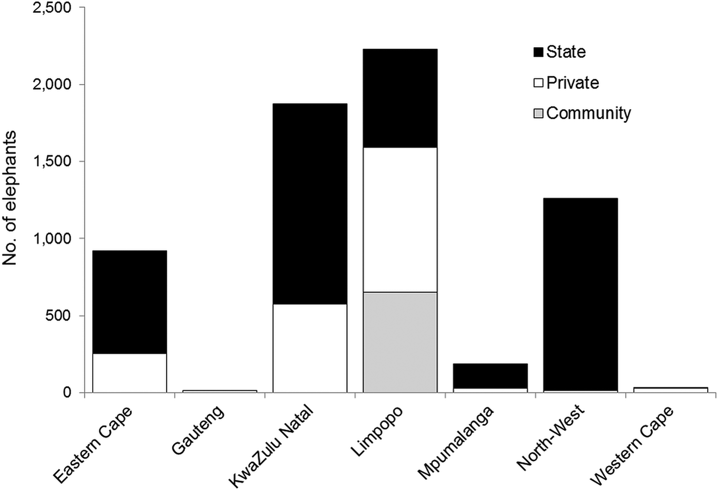 South Africa's elephant populations are spread across seven of the country's eight provinces (Fig. 2). Only the Northern Cape Province, in the arid north-west of the country, has no elephants. Gauteng Province is home to a population of just 13 individuals, and Limpopo Province hosts the majority of the country's elephants, even excluding those found within the Greater Kruger area. Many of Limpopo's non-Kruger elephants occur on privately owned land, the rest being divided between state and community-owned reserves. North-West Province hosts the most state-owned elephants (1,246) outside Greater Kruger (Table 1; Fig. 3).