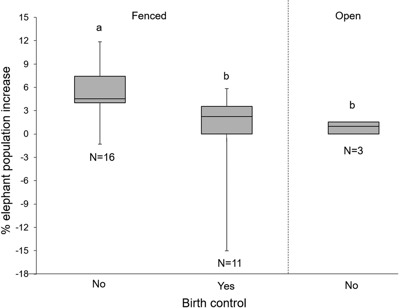 Fig. 5 Difference in mean annual percentage elephant population increase between reserves using birth control, reserves that do not, and open and fenced systems (boxes indicate the lower and upper quartile, and whiskers the lowest and highest percentage increases; a is significantly higher than b).