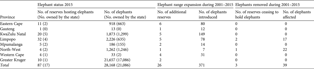 During 2001–2015 26 reserves introduced elephants for the first time. These introductions occurred mainly in the Eastern Cape (80 elephants on six reserves), KwaZulu Natal (149 elephants on five reserves) and Limpopo (78 elephants on five reserves; Table 1). All of these reserves are privately owned, and the elephants introduced to them originated from various existing reserves, including in the Greater Kruger area (Table 1).