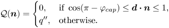 \begin{equation} \mathcal{Q}(\boldsymbol{{n}})=\begin{cases} 0, & \text{if} \ \cos(\pi- \varphi_{cap}) \le \boldsymbol{d} \boldsymbol{\cdot} \boldsymbol{n} \le 1,\\ q'', & \text{otherwise}. \end{cases} \end{equation}