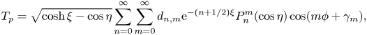 \begin{equation} T_{p} = \sqrt{\cosh \xi - \cos\eta} \sum_{n=0}^{\infty} \sum_{m=0}^{\infty}d_{n,m} \textrm{e}^{-(n+1/2)\xi} P_n^{m}(\cos\eta)\cos(m\phi + \gamma_m), \end{equation} where