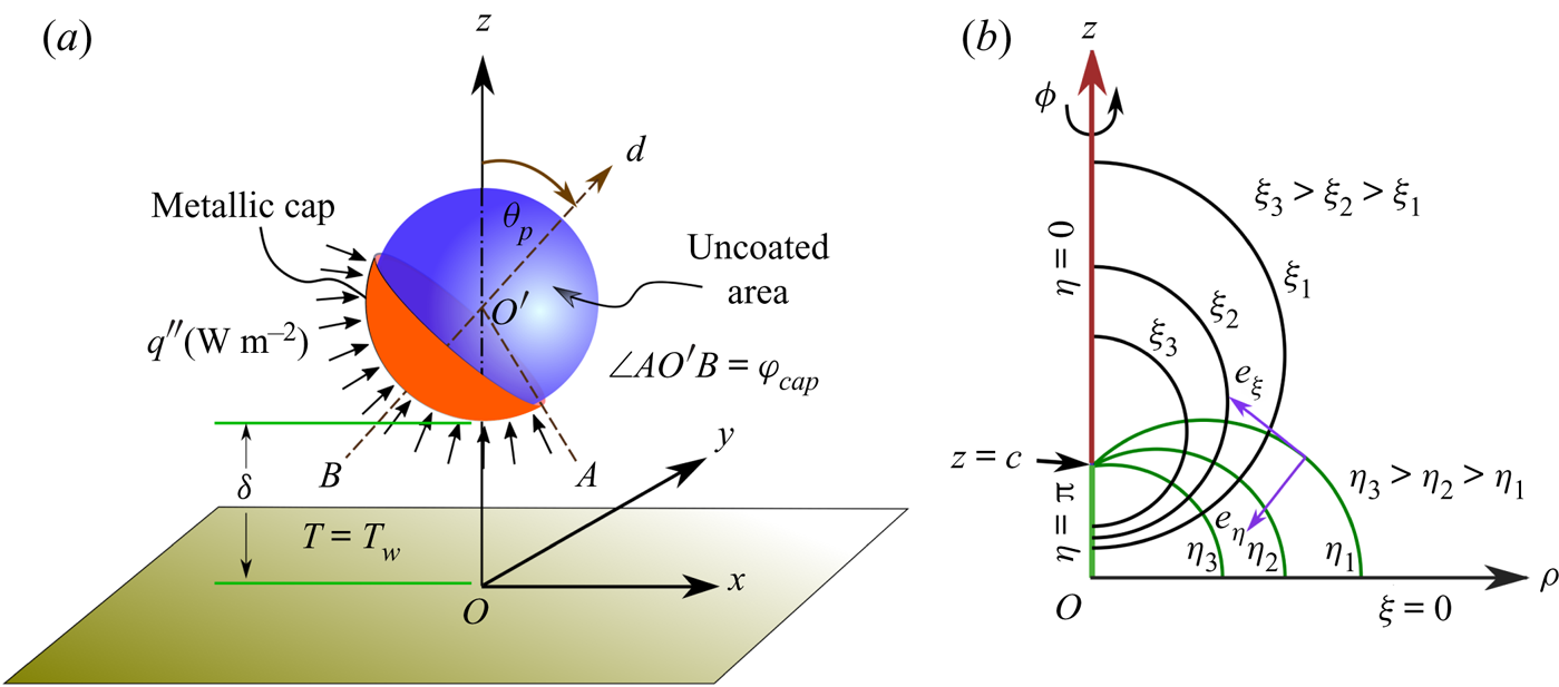 $\boldsymbol {{d}}$, as shown in the figure 1(a). Upon irradiation of a laser beam, an asymmetric conversion to thermal energy takes place along the coated and uncoated faces of the particle. This has been modelled by incorporating a heat flux,