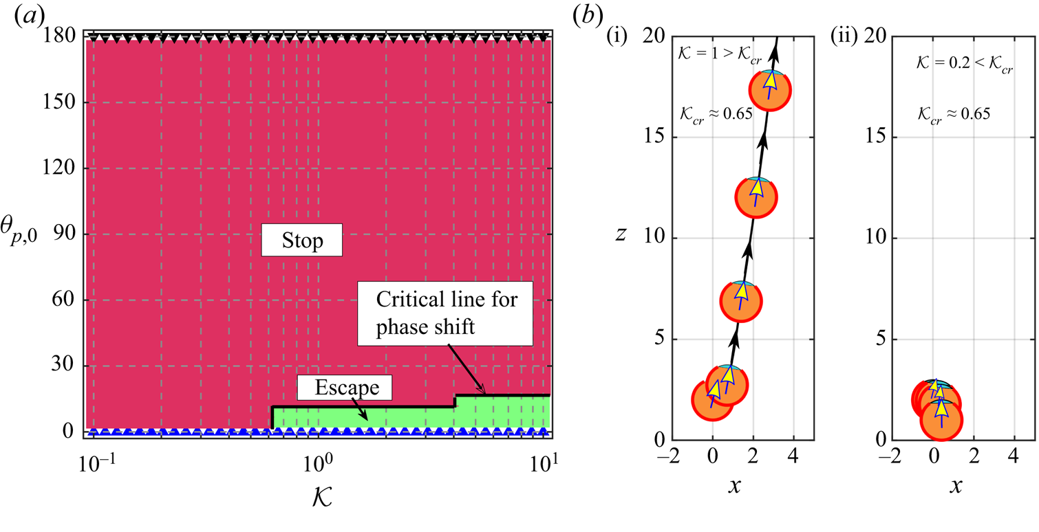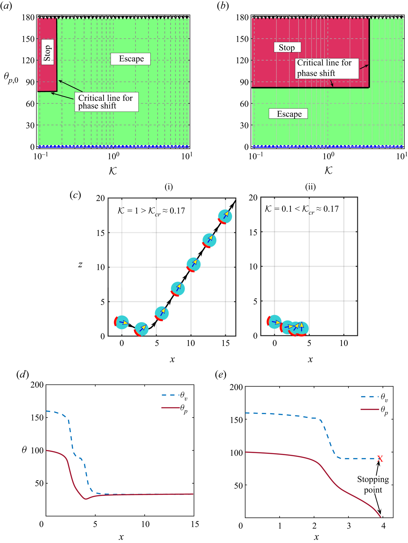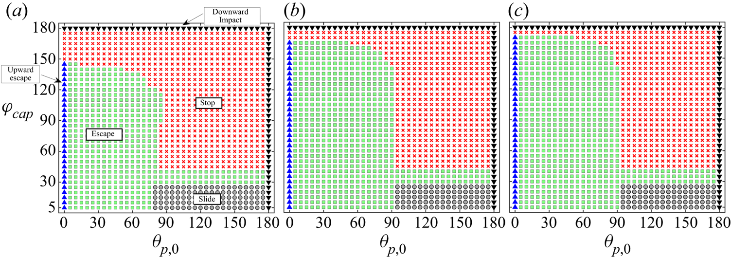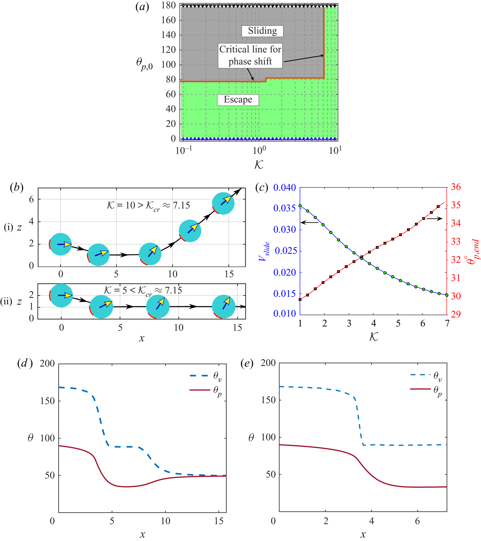 $\theta _{p}$ has been presented in figure 15(d). While this only provides an insight into the impending downward or upward motion during launching, a sliding to escape or escape to stopping transition of swimming states takes place due to qualitatively similar reasons of alterations in particle rotation