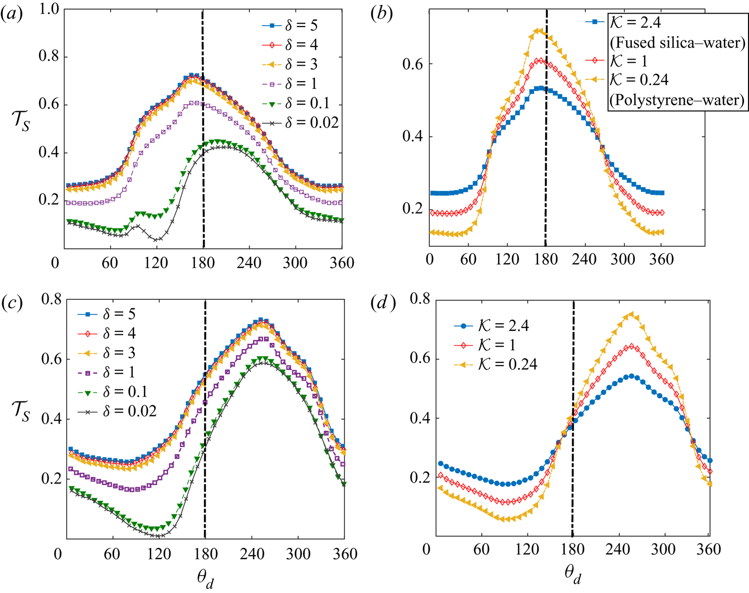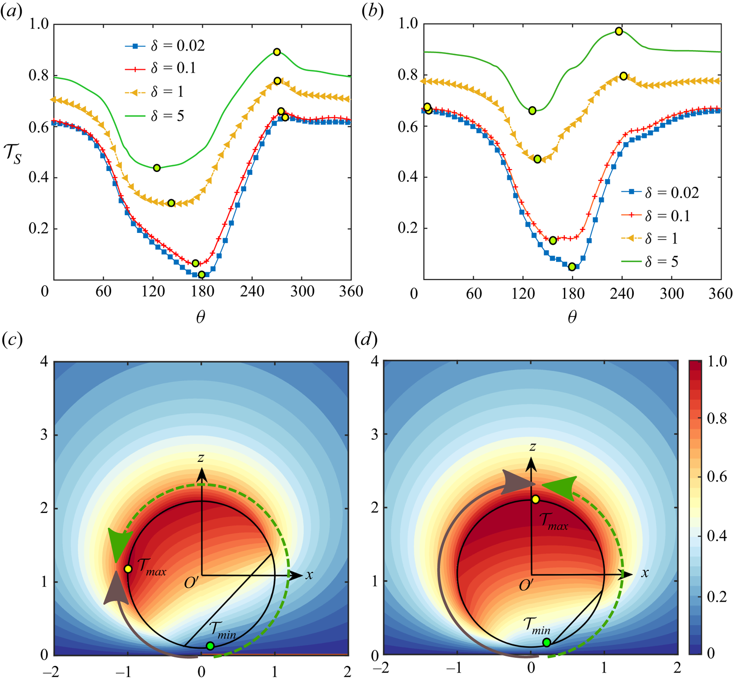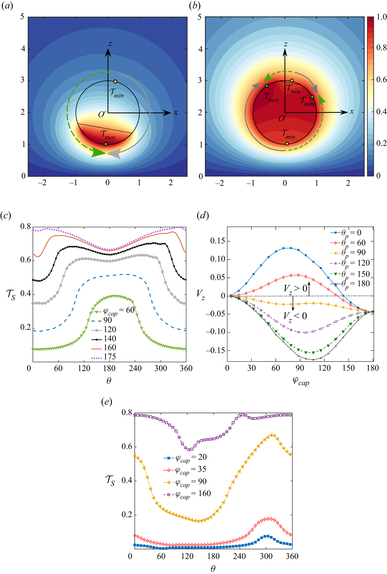 $(\mathcal {T}_{max}-\mathcal {T}_{min} )$, but not the peak locations on the swimmer surface (refer to figure 3). Conversely, the cap angle