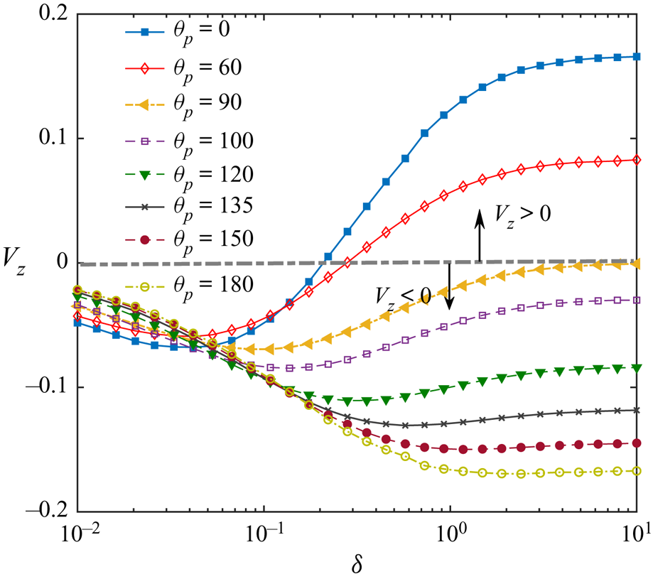 $\theta _{p,0}$. These figures help elucidate some key differences in the trajectory characteristics with those presented previously in connection with the self-diffusiophoresis phenomenon near a solute-impenetrable plane wall (Uspal et al. Reference Uspal, Popescu, Dietrich and Tasinkevych2015a; Ibrahim & Liverpool Reference Ibrahim and Liverpool2016; Mozaffari et al. Reference Mozaffari, Sharifi-Mood, Koplik and Maldarelli2016). In order to readily compare with such a widely studied problem, the geometry of the swimmer-wall system and the swimmer orientation have been defined in an exactly similar manner to those of Mozaffari et al. (Reference Mozaffari, Sharifi-Mood, Koplik and Maldarelli2016). Firstly, the thermophoretic force is of a strikingly distinct nature in imparting a downward motion to the micromotor even when the director initially faces away from the wall (e.g. in figure 14a). Secondly, in the corresponding problems addressed, it was found that the micromotor does not achieve a velocity of