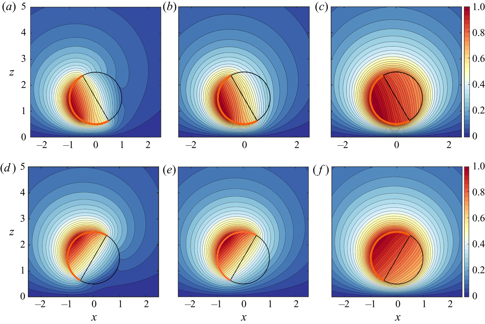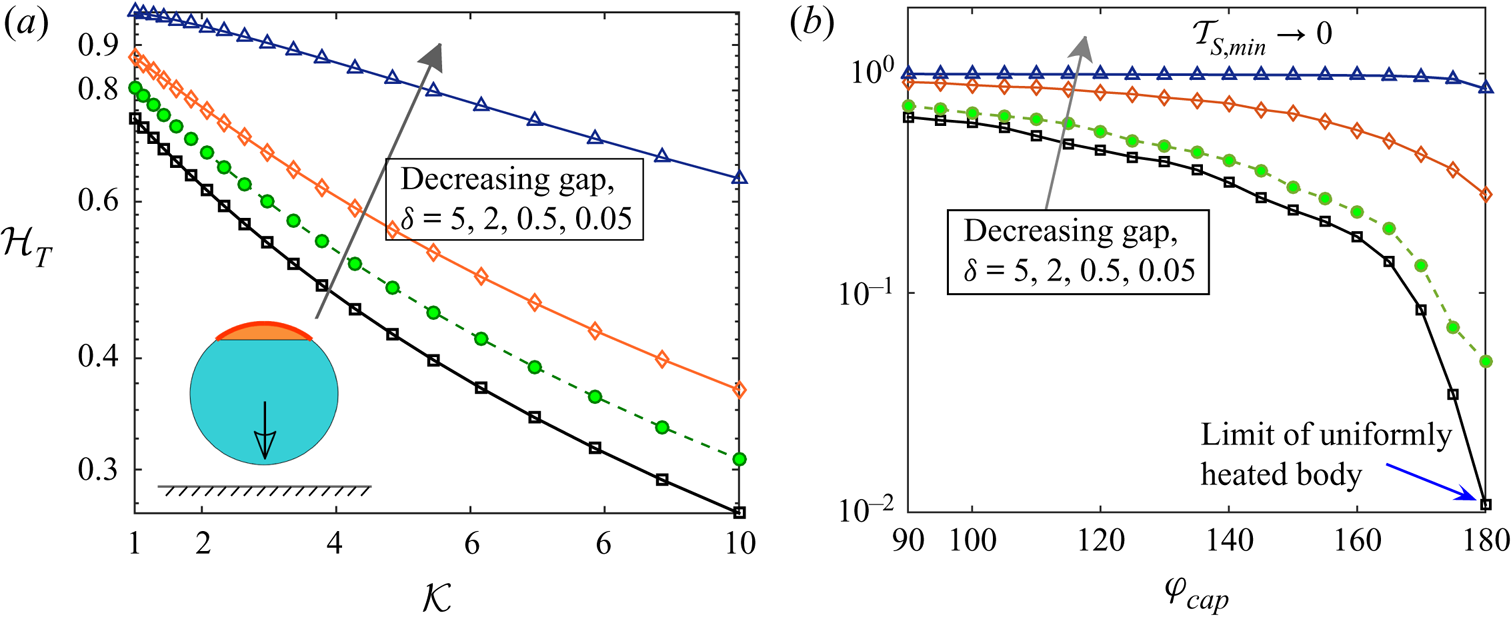 As the capped area becomes more extensive, the distortion of the temperature field becomes intrinsically different, which can be visualized by comparing the temperature profiles in figure 15(a,b). This is also reflected in the appearance of two distinct maxima points on the