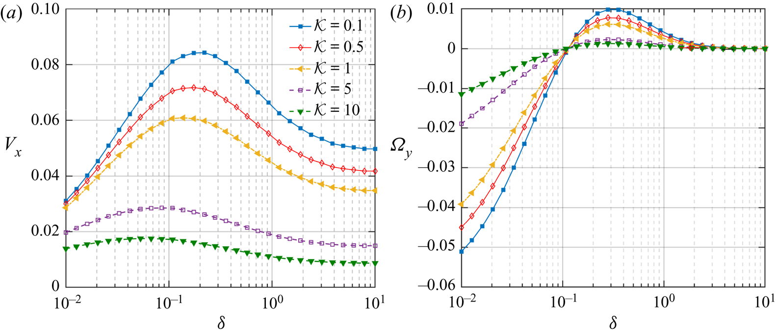 Figure 18. Variation of wall-parallel translational and rotational velocities of the microswimmer with distance from the wall