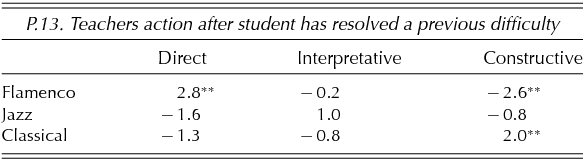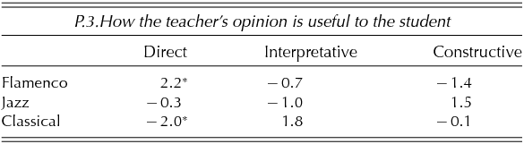Question 1 for the Learning dimension (what student difficulties are due to) has a significant value (χ2(4) = 12.13, p = 0.016), and the ASRs show that the values for FL are higher than expected for the Direct Theory and lower than expected for the Interpretative Theory. There is also a question – Question 10 (how guitarists learn musical pieces by heart) – whose value is significant with marginal probability (χ2(4) = 8.59, p = 0.072) and the ASRs show that he value for FL is higher than expected for the Direct Theory, the value for JZ is higher than expected for the Interpretative Theory and the value for CL is higher than expected for the Constructive Theory (Table 9).