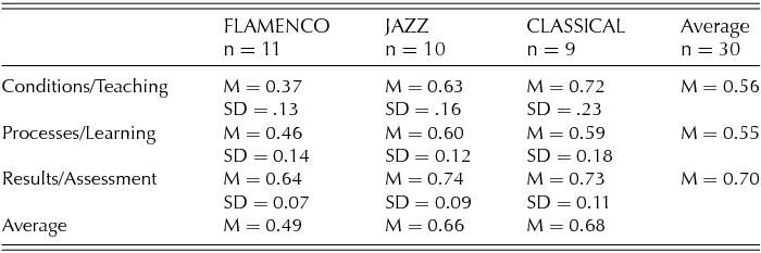 It seems that there is a small problem in establishing that Classical and Jazz cultures belong to formal and non-formal respectively, as defined above. However, Flamenco is popular music, as Jazz is, although there are significant differences in their social contexts. It is true that at a semi-professional level learners are supervised by teachers as in other cultures. But these apprentices carry a significant musical baggage of learning in the home environment (Howe & Sloboda, Reference HOWE and SLOBODA1991), and not exclusive to the instrument, but a more global learning (in percussion, singing and dancing). In fact, teachers are usually the most experienced members of the family (both close and distant), who learners often call ‘uncle’. This previous background, which learners would have, has been defined as informal context.