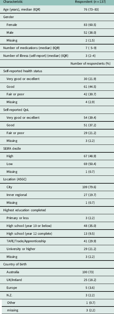 IQR=interquartile range; QoL=quality of life; SEIFA=Socio-Economic Index for Areas; ASGC=Australian Statistical Geography Standard.