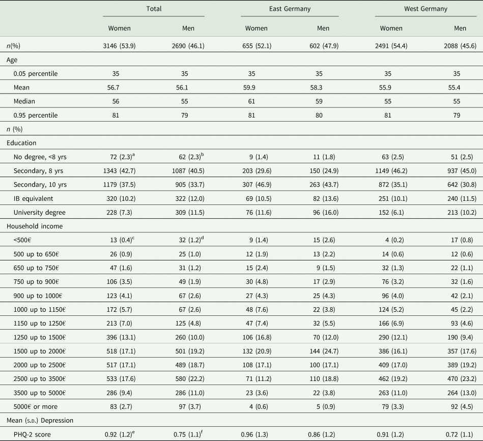 The characteristics of the total sample, and the East and West German subsamples are presented in Table 1. Concurrent with population data, there were more women than men in the sample. The frequency distributions (women/men × East/West) did not differ significantly (p = 0.149). Of the 3146 women, 86.1% had turned 18 at the time of the German reunification, while this was the case for 85.1% of the 2690 men. East German women were older (Z = 6.622; p < 0.001) and had a higher level of formal education (Z = 7.647; p < 0.001) than West German women. The same was true for East German men, they were older (Z = 4.693; p < 0.001) and had a higher level of formal education (Z = 7.909; p < 0.001) than West German men (Table 1). Concerning household income, West German women reported a higher household income than East German women (Z = −9.069; p < 0.001), as did West German men in comparison to East German men (Z = −9.666; p < 0.001). In regards to depression scores, no significant differences between East and West German women could be obtained (p = 0.403), however, East German men reported higher scores than West German men (Z = 2.976; p = 0.003).