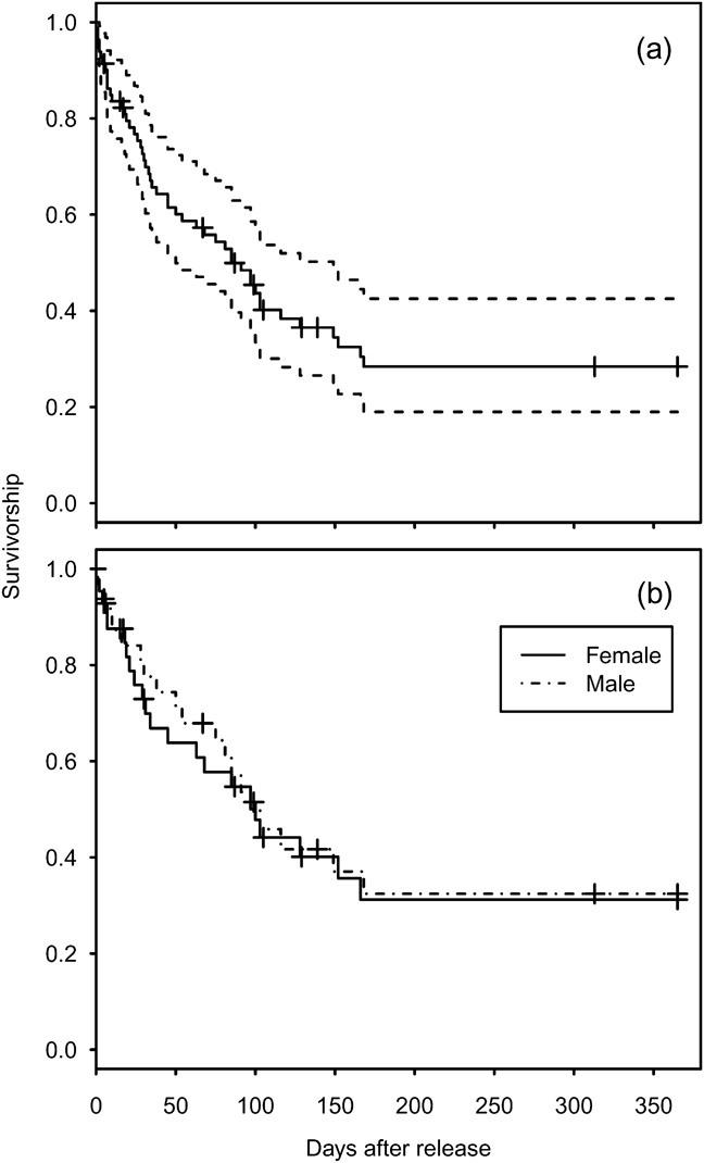 Fig. 1 Estimated survival of reintroduced great bustards Otis tarda. (a) All 86 individuals released between September 2004 and September 2009 (solid line), and 95% confidence intervals (dashed lines). (b) Survivorship separated by sex for 45 females and 33 males. Cross-hair ticks indicate censored individuals that were not recovered or resighted after the indicated date during the 365 days.