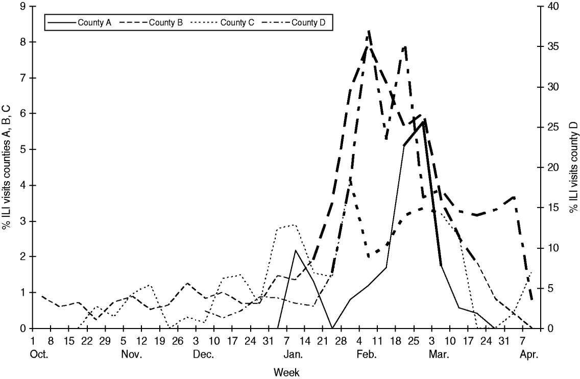 We adapted criteria based on ILI from CDC's Sentinel Providers system [14] to define periods of peak influenza activity. An ILI proportion above a predetermined threshold correlates well with influenza illness during times when influenza is known to be circulating in a community. Thus, we included data on positive quick tests for influenza infections in our definition of peak influenza activity. The period of peak influenza activity in three of the counties was defined as a period of ⩾2 contiguous weeks during which sentinel physicians reported that >2% of patient visits were for ILI and ⩾2 influenza quick tests were positive, allowing 1-week gaps in contiguous positive weeks. The 2% threshold was based on region-specific CDC criteria.