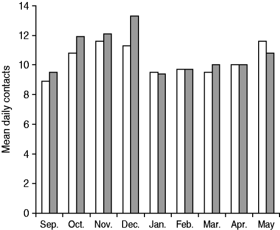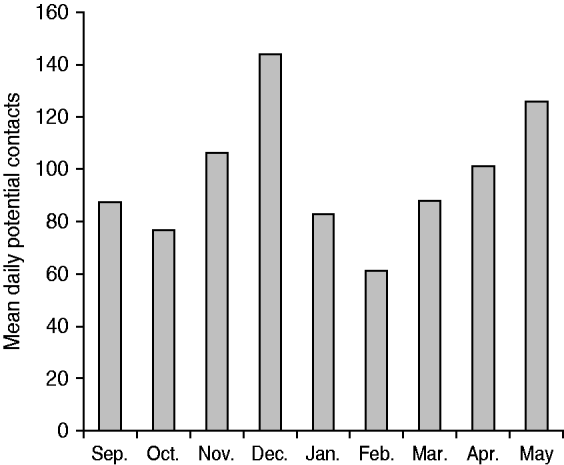 Fig. 3. Children's estimated daily potential social contacts by month during the 2007–2008 influenza season in four North Carolina counties.