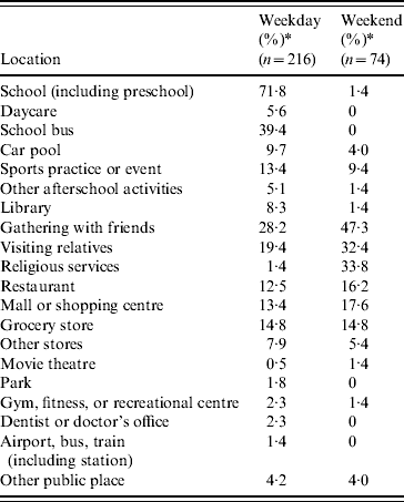 For children, the most commonly frequented location outside the home during weekdays was school, followed by journey on a school bus, gathering or visiting with friends and relatives, and going to the grocery store (Table 2). On weekends, children were reported most frequently to attend gatherings with friends, attend religious services, visit relatives, go to a shopping mall or shopping centre, and go to restaurants.