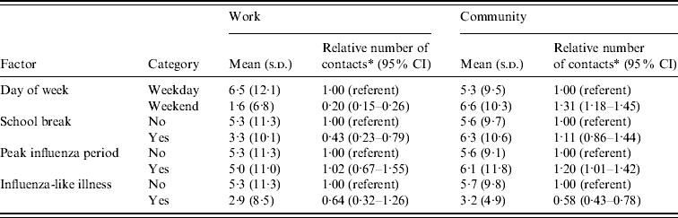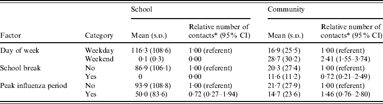 The school setting was the main determinant of differences in children's potential social contacts, according to day of the week and periods of school breaks (Table 6). Children's potential contacts in community settings increased on weekends but not during school holidays. Crude means of children's potential social contacts at school and in the community were both lower during periods of peak influenza activity than during other periods, but the adjusted results did not indicate a significant difference during periods of peak influenza activity.