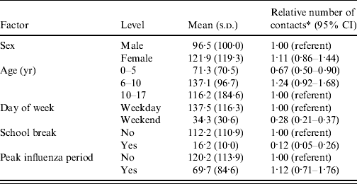 Children aged <6 years had fewer potential contacts than older children (Table 5). Reflecting the large number of potential social contacts at school, potential contacts were much lower on weekend days than on weekdays and also decreased substantially during school breaks. The crude mean potential social contacts was substantially lower during periods of peak influenza activity than during other periods, but when the data were adjusted for potential confounding factors, including month, the difference was no longer apparent.