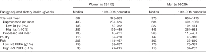 Baseline characteristics of the study participants were summarised using medians and 80 % central ranges for continuous variables and proportions for categorical variables. Intakes of meat and fish were energy adjusted, using the residual method( Reference Willett and Stampfer 17 ). The residual energy-adjusted variables were only used for descriptive purposes.
