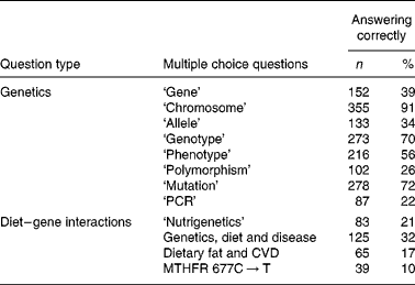 In the diet–gene knowledge section, there were low numbers of correct answers to each question, ranging from 10 % correctly identifying the effect of the methylenetetrahydrofolate reductase 677C:T mutation up to 32 % correctly identifying the potential impact of genetics on diet and disease (Table 2). Throughout most of this section dietitians used the ‘don't know’ response.