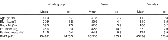 * Body composition was measured using air displacement plethysmography, whereas RMR was measured using indirect calorimetry. Details of the procedures used can be found elsewhere( Reference Caudwell, Finlayson and Gibbons 26 ).