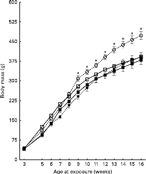 Fig. 2 Evolution of the body weight of pups over the 14-week experimental period. Values are means, with their standard errors represented by vertical bars. Treatment was initiated at 21 d of age in male offspring. However, intake data were recorded only from week 5 of treatment (age 7 weeks) to the end of treatment at week 14 (age 16 weeks). CON-CON (