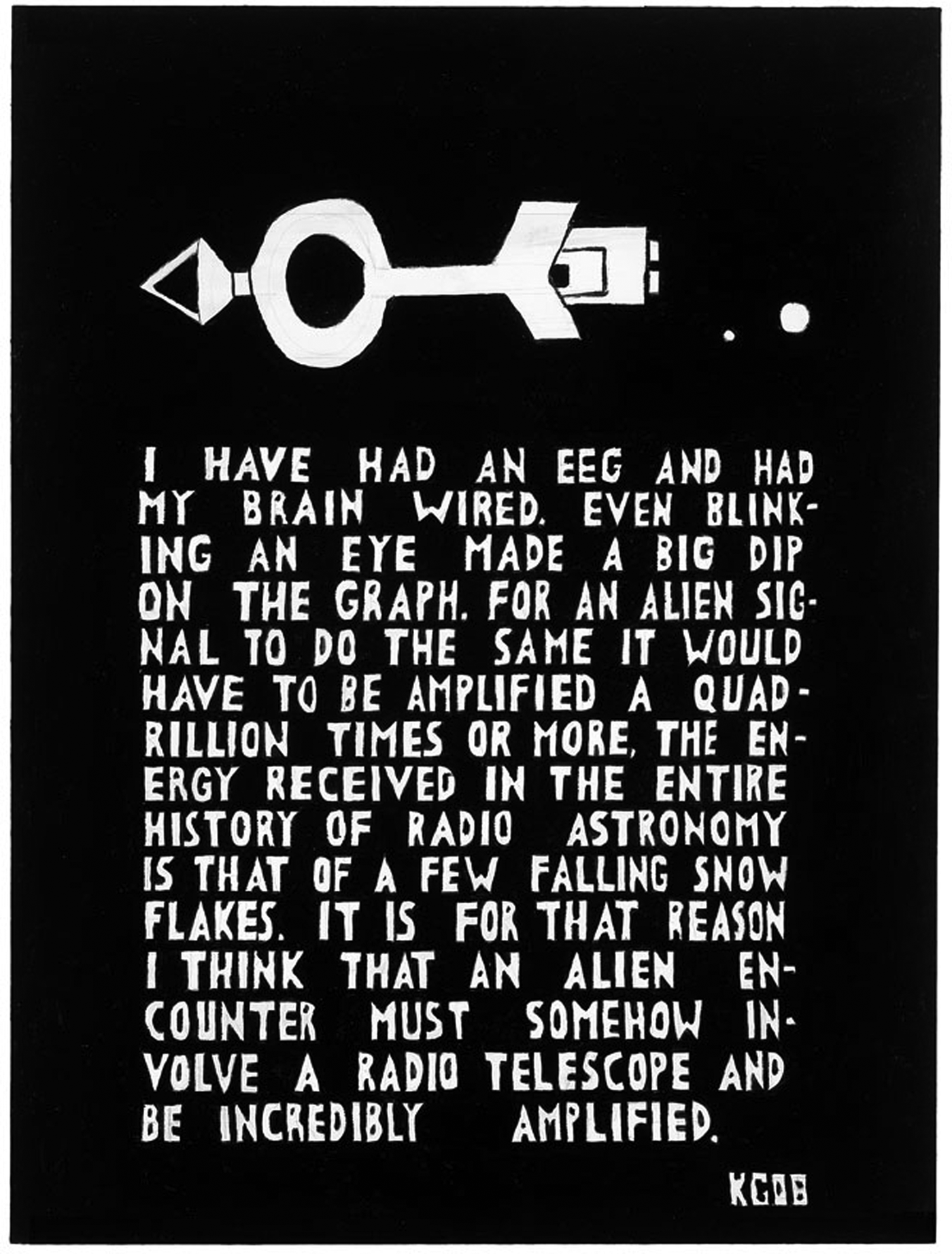 Since the mid-1980s, Grimes has used to his art to document, depict and convey his discoveries and speculations about the space-related subjects that have intrigued him. His paintings are dramatic. Working almost exclusively in black and white acrylic paint on canvas or wood, or in black ink on white paper, Grimes presents bold, sparsely drawn symbols and texts (Russell, Reference Russell2005). His paintings illustrate and describe mysterious occurrences, troubling questions, or speculative arguments about extraterrestrial phenomena that have become part of the public discourse or that the artist has investigated on his own. Very often, a Grimes painting may consist primarily or even entirely of a text rendered in his signature white block letters. Typically, such a work might describe unusual, space-related phenomena, summarise narratives about strange incidents, or detail myriad bits of arcane data in the conviction that he – and perhaps, he wonders, only he – might be able to identify significant patterns and reveal elusive meanings in the collective record and in his personal experience that proves space–alien contact with Earth.