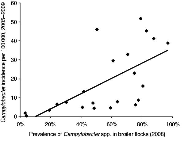 Fig. 4. Comparison of estimated true incidence rate of human campylobacteriosis in the European Union member states with the prevalence of Campylobacter spp. on broiler chicken carcasses. Each symbol (◆) represents one member state.