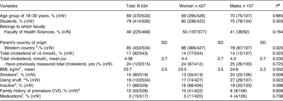 Of the total sample of 534 students and employees, most (80 %) of the samples were female students in the age group of 18–30 years. Mean total cholesterol level and BMI were within the normal range in both men and women, but there were a higher proportion of men (27 %) than women (17 %) who used snuff and/or smoked (24 v. 13 %) (Table 1).