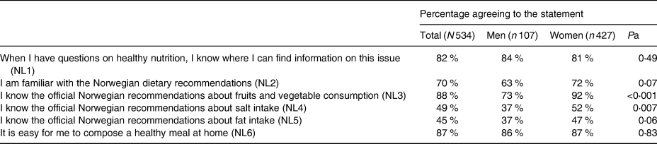 Of the total population, 82 % agreed to the statement that they knew where to find information on healthy nutrition issues (NL1). Furthermore, 70 % reported that they were familiar with the Norwegian dietary recommendations (NL2). Among specific food or nutrient recommendations, the majority (88 %) agreed that they were familiar with the recommendation about fruit and vegetable consumption (NL3), whereas the recommendation for salt intake (NL4) and fat intake (NL5) was less known (49 and 45 %, respectively). There was a higher proportion of women than men that reported to be familiar with all the specific nutrient recommendations (Table 2).